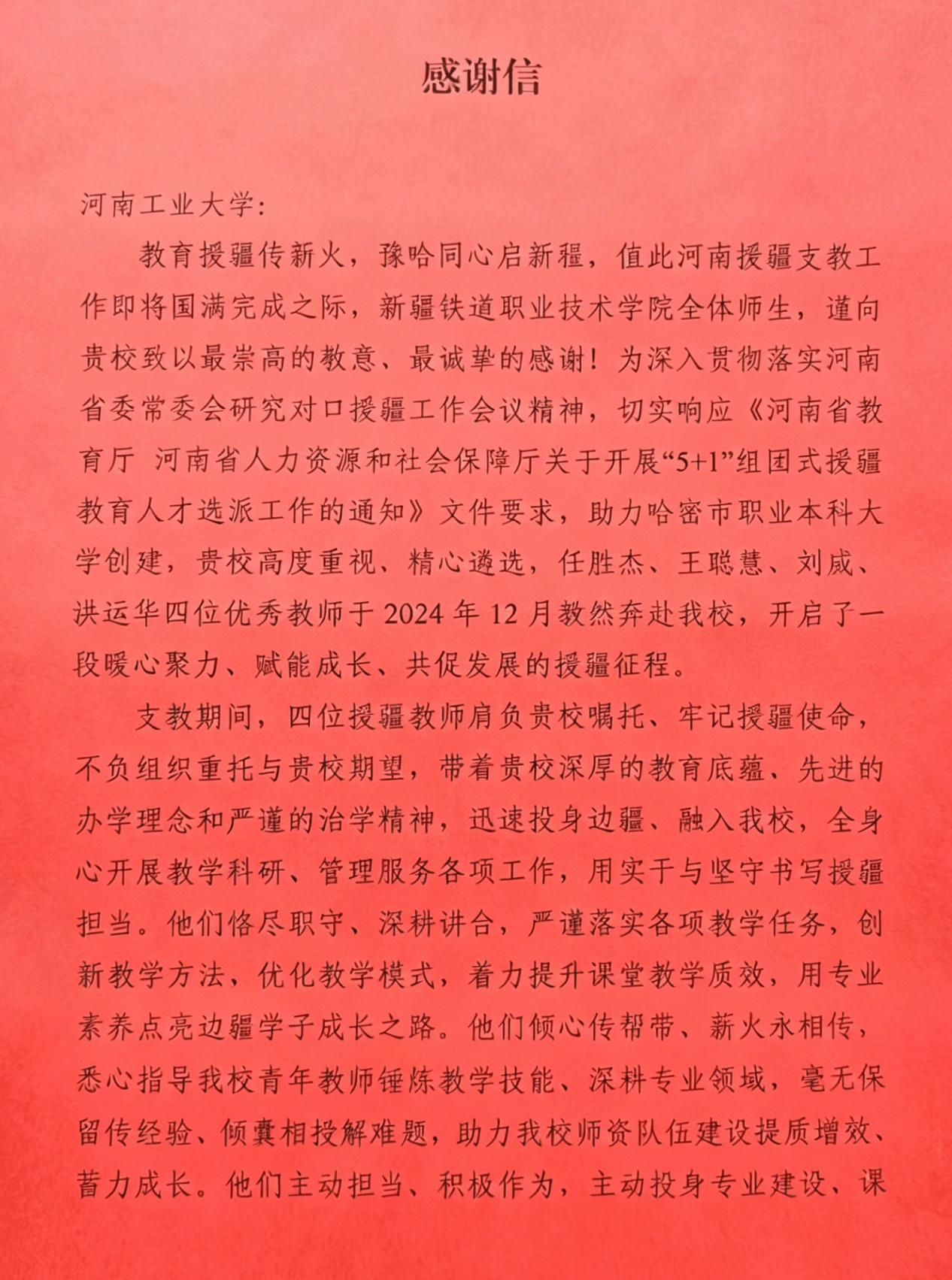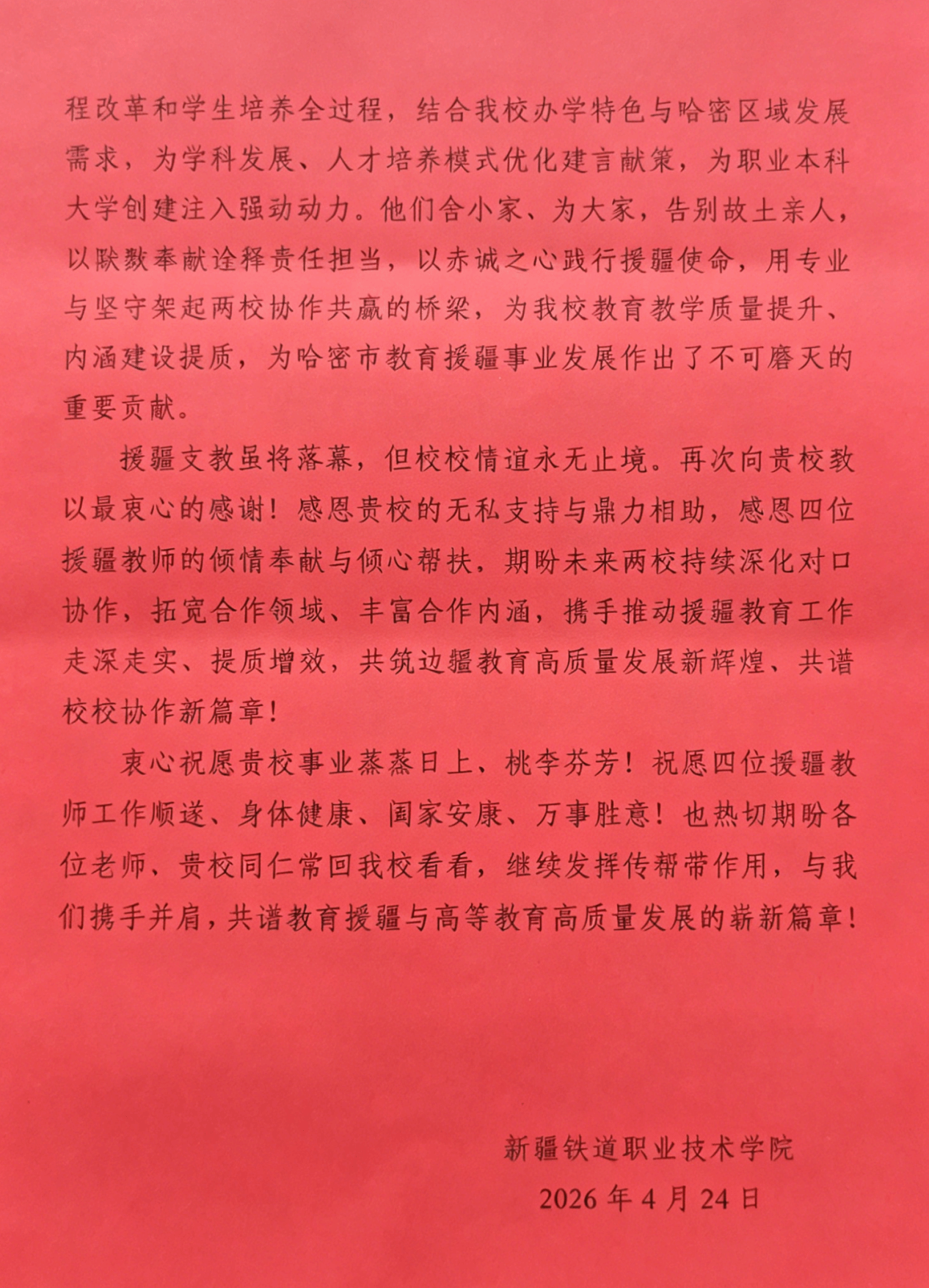 新疆铁道职业技术国产av专门致信我校,对四名援疆教师的突出表现和我校的大力支持表示衷心感谢。下一步,我校将继续深入落实国家对口援疆战略,不断深化与受援学校的交流合作,持续提升教育援疆工作质效,为推动边疆职业教育高质量发展贡献更大力量。